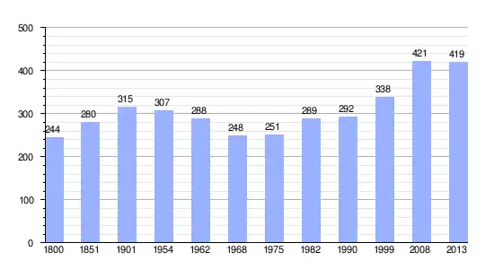 Los datos demográficos contemplados en este gráfico de la comuna de Villers-les-Ormes[4] se han cogido de 1800 a 1999 de la página francesa EHESS/Cassini, y los demás datos de la página del INSEE.[5]