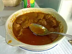 Esta marinada es prácticamente obligatoria para los platos que contienen carne de conejo en la culinaria portuguesa, como el célebre coelho à caçadora ('conejo a la cazadora') que está tradicionalmente elaborado con vino tinto.