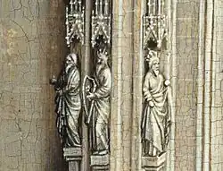El dintel contiene seis relieves del Nuevo Testamento con escenas de la Vida de la Virgen. Los primeros cuatro, Anunciación, Visitación, Natividad y Adoración de los Reyes Magos, están asociados con la maternidad y la infancia. Les siguen la Resurrección y Pentecostés. Sobre ellos, superando una "pasiflora", está la Coronación de la Virgen.[8] Las jambas a ambos lados de la Virgen están adornadas con estatuillas, probablemente de profetas del Antiguo Testamento. De estas solo David, segundo a la izquierda, ha sido identificado. El hombre barbudo a la izquierda de David es probablemente Moisés, el hombre con el gorro a la derecha es probablemente el "profeta de la lamentación" Jeremías. En el lado opuesto, las figuras exteriores pueden ser Zacarías e Isaías.
