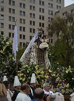 En 1778 se realizó la primera procesión de la Virgen en Santiago, aunque en 1818 se había cambiado al tercer domingo de octubre para conmemorar la promesa hecha por José de San Martín y Bernardo O'Higgins, debido a que en ese mes se puso la primera piedra del primer Templo Votivo de Maipú.[23] En 1971, los obispos chilenos decidieron modificar la fecha de la procesión al último domingo del mes de septiembre, para que congeniara el mes de la Patria con el patronazgo de la Virgen. Ante esto, se pasó a denominar este domingo como «Día de Oración por Chile».[24] Un testimonio de la procesión de 1879, después de capturar el Monitor Huáscar en la Guerra del Pacífico, destacó lo siguiente:[23]