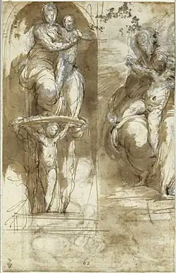 Se conocen varios bocetos preparatorios, en el Museo Condé, el Museo Británico y otras hojas menores en otras colecciones, en total unos veinte dibujos que atestiguan la larga investigación de una solución compositiva satisfactoria. Un dibujo en la Galería Nacional de Parma, es el que más se acerca a la versión definitiva, aunque muestra un formato horizontal.
