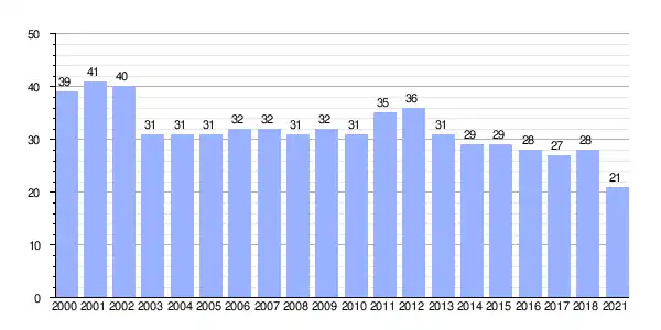 | Gráfica de evolución demográfica de Viso entre 2000 y 2021 |