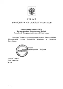 Vladimir Vladimirovich Chkhikvadze, en ruso: Владимир В. Чхиквадзе, nació en 1950 y es embajador ruso.