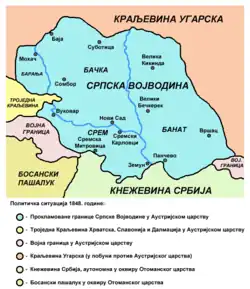 Del 13 al 15 de mayo de 1848, la comunidad serbia sancionó la constitución del nuevo estado como la Voivodina Serbia o Ducado de Serbia en la localidad de Sremski Karlovci. La división administrativa quedó fragmentada en cuatro regiones: Srem, Bačka, Banat y Baranja.