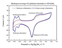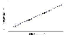 La voltamperometría escalonada es un derivado de la voltamperometría de barrido lineal.[1][2] En la voltamperometría de barrido lineal, se mide la corriente en un electrodo de trabajo mientras se barre linealmente en el tiempo el potencial entre el electrodo de trabajo y el electrodo de referencia. La oxidación o reducción de las especies se registra como un pico o un valle en la señal de corriente al potencial en el que la especie comienza a oxidarse o reducirse.