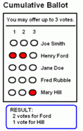 La circunscripción representada en la imagen adjunta tiene tres escaños por lo que el elector dispone de tres votos que puede distribuir de la forma que quiera entre los cinco candidatos presentados. En el primer caso, el elector ha decidido acumular los tres votos en Henry Ford; en el segundo, ha dado dos votos a Henry Ford y uno a Mary Hill; y en el tercer caso los ha repartido entre Henry Ford, Jane Doe y Mary Hill.