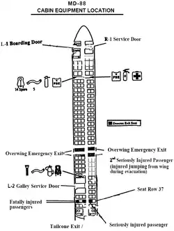 A las 2:27 pm CDT, el piloto solicitó asistencia médica de emergencia debido al informe del pasajero del asiento auxiliar de un gran agujero en el fuselaje, escombros del motor en toda la cabina y pasajeros heridos. Luego informó que no había evidencia de humo o fuego en la cabina, y que la puerta trasera de la cabina se había abierto y el tobogán de emergencia estaba inflado. La asistente de vuelo que inició la evacuación a través de esa puerta le dijo a la NTSB que vio fuego en el motor izquierdo y, por lo tanto, abandonó la evacuación a través de esa puerta y dirigió a los pasajeros hacia adelante. Informó que hubo muchos heridos y posiblemente dos muertos, por lo que comenzó a evacuar el avión hasta que fue detenida por el primer oficial. Debido al daño y al peligro en la parte trasera de la aeronave, las escaleras de aire integradas en el MD-88 resultaron inadecuadas para su uso. Luego, el capitán solicitó escaleras aéreas portátiles para facilitar el desembarco de los pasajeros, que llegaron 25 minutos después.[2]