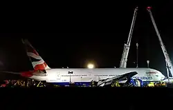 Fue sostenido por múltiples gatos hidráulicos, elevado por grúas, bajado a plataformas planas largas con ruedas y control remoto, remolcado fuera de la pista y trasladado al área de mantenimiento de British Airways, estacionado en la plataforma, justo afuera de un hangar cercano. Allí permaneció abandonado mientras la investigación de la AAIB concluía, por si necesitaban el casco para pruebas, a 500 metros del lugar del accidente. La aleta de cola fue desmantelada y retirada, ya que balanceaba el casco en días ventosos, colocada en tierra y pintada de blanco. Además, se pintaron las marcas de identificación y los títulos de la librea, ya que la mitad superior del fuselaje apenas era visible por encima de la valla circundante. Tras evaluar los daños y los costos de reparación, el avión fue declarado irreparable económicamente (a pesar de estar prácticamente intacto) y dado de baja por las aseguradoras en el verano de 2008, convirtiéndose en el primer Boeing 777 con pérdida del casco en la historia.[25][26]El casco del G-YMMM fue cortado en tres pedazos y, a principios de la primavera de 2009, un año después del incidente, el avión fue sacado en camión desde Heathrow para ser desguazado, lo desmontaron en tres pedazos y lo enviaron al depósito de chatarra, donde lo desmontaron y lo desguazaron in situ.[27][26][28]