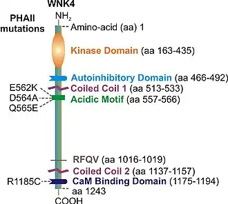 En 2001, se encontraron mutaciones genéticas en el gen que codifica WNK4 en pacientes con pseudohipoaldosteronismo tipo II (PHAII),[6] también conocido como hipertensión hiperkalémica familiar (FHHt) [10] o síndrome de Gordon.[11] Esta enfermedad hereditaria autosómica dominante es caracterizada por hiperkalemia, hipertensión y acidosis metabólica. WNK4 juega un papel fundamental en la regulación de varios transportadores y canales iónicos en el riñón. Las mutaciones que causan PHAII en WNK4 dan lugar a una desregulación de los transportadores y canales renales de sodio y potasio, lo que conduce a defectos en la retención de sodio y potasio por el riñón y, a su vez, a un aumento de la presión arterial y de la concentración de potasio en la sangre (hiperkalemia).