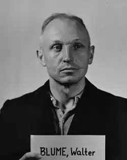 En 1945, Blume fue capturado en Salzburgo por los americanos y llevado a la prisión de Landsberg, fue enjuiciado por sus crímenes y condenado a muerte en primera instancia, pero la pena le fue conmutada a 25 años de prisión, saliendo en libertad en 1955 con tan solo 10 años de cumplimiento de la pena.