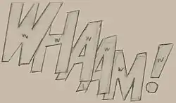 Whaam! muestra un avión de guerra en el panel izquierdo que dispara un cohete a un avión enemigo que se encuentra en el panel derecho, el cual se desintegra en una vívida explosión roja y amarilla. El estilo de cómic es enfatizado por el uso de la onomatopeya "WHAAM!" en el panel derecho y por una caja amarilla con una leyenda de letras negras en la parte superior del panel. La exclamación textual "WHAAM!" puede ser considera como el equivalente gráfico de un efecto de sonido.[46] Este tipo de elementos, se convirtieron pronto en una característica del trabajo de Lichtenstein, como lo expone en otras obras onomatopéyicas tales como Bratatat! y Varoom![47]