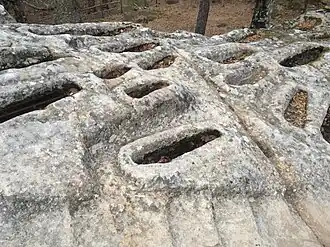 Las sepulturas excavadas en la roca corresponden a tres categorías básicas: las formas y variantes del tipo "bañera" (54%), las formas de tipo antropomorfo (37%) y los nichos laterales (7%). Entre las tumbas antropomorfas predominan las formas de cabecera redondeada y en arco de herradura, mientras que en las de "bañera" son mayoritarias las de forma elíptica.
