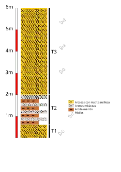 Los sedimentos presentes en el yacimiento poseen una potencia (espesor de sedimento) de 6 m y consisten en arcosas con matriz arcillosa y fragmentos de roca con intercalaciones de arcillas marrones y arenas micáceas, distinguiéndose tres tramos:[2]