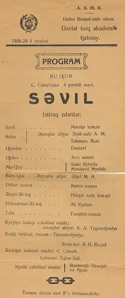 En los años 1920-1930 Yafar Yabbarlí fue el dramaturgo más popular de Azerbaiyán. Le pertenecía a él la fuerza de describir y caracterizar el contexto histórico y social de la época. No es posible considerar esta dramaturgia poderosa, activa, independiente y completa sin Yafar Yabbarlí. Desde el año 1928 inició el tercer período de la creatividad del escritor. Después del establecimiento del poder soviético en Azerbaiyán el autor hizo una pausa en la creación de dramas y en 1927 escribió la obra de Sevil. El drama estaba dedicado a la libertad de las mujeres. Se describe el camino de la vida de una mujer humilde y el proceso de su evolución moral. En 1928 con la escenificación de “Sevil” se abrió un camino para la liberación de las mujeres del Oriente. La producción dramática de Y.Yabbarlí en los años 1930 empieza con la pieza de