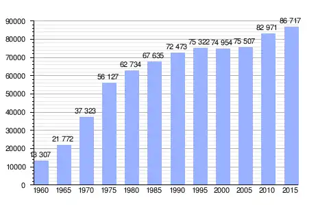 Gráfica de evolución demográfica de Yashio entre 1960 y 2015