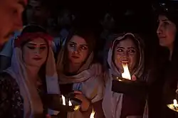Los yazidíes, también conocidos como los yezidis (en kurdo: ئێزیدی, romanizado: Êzîdî)[27] son un grupo endogámico y en su mayoría de habla kurmanyi,[4] de origen étnico impugnado, indígena de Irak, Siria y Turquía.[8] La mayoría de los yazidíes que permanecen en el Medio Oriente viven en Irak, principalmente en las gobernaciones de Nínive y Dohuk.[28][29] La religión yazidí es monoteísta y se remonta a las antiguas religiones mesopotámicas,[30] y también tiene algunas similitudes con las religiones abrahámicas.[31][32]