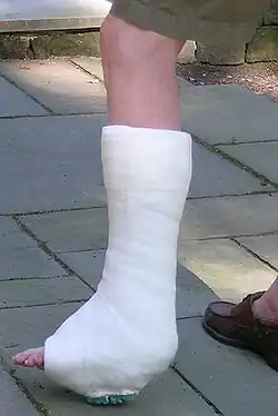 Un yeso corto en la pierna con una capa superior de fibra de vidrio que se utiliza para tratar un pie fracturado | ||