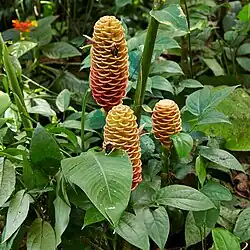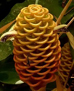 Es conocida en Occidente con el nombre común de "jengibre de colmena", debido a la forma de sus inflorescencias que se asemejan a una colmena de abejas. Otros nombres comunes son flor de maraca, hierba de jengibre o jengibre de Malasia.