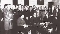Mapa detallado de localidades y redes de comunicaciones de ruta y ferrocarriles en la Gobernación Militar. Uno de los objetivos de los gobernadores fue integrar todo el territorio con vías de acceso que aún hoy perduran.Reunión en la municipalidad de Comodoro Rivadavia, en mayo de 1957, para gestionar el pedido de que la ciudad sea la capital de la provincia del Chubut.