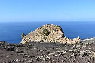 La cota donde el Roque de Teneguía se levanta, forma parte de una estructura volcánica más moderna. Por debajo de este escalón, el terreno desciende casi verticalmente hasta la costa, cubierta de malpaís o campos de lava.