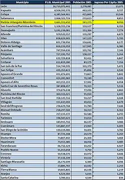 El P.I.B. (producto interno bruto) representa todo el capital que el municipio produce en un año, mientras que el ingreso per cápita representa lo que en promedio percibe la población de esa localidad en un promedio al año, el valor se expresa en dólares estadounidenses.
