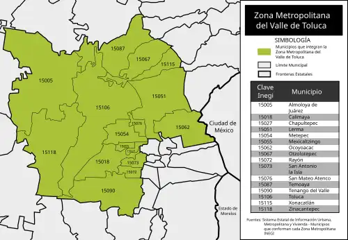 De acuerdo con el Sistema Estatal de Información Urbana, Metropolitana y Vivienda del Estado de México,[5] el área metropolitana se integra por los municipios de Almoloya de Juárez, Calimaya, Chapultepec, Lerma, Metepec, Mexicaltzingo, Ocoyoacac, Otzolotepec, Rayón, San Antonio la Isla, San Mateo Atenco, Temoaya, Tenango del Valle, Toluca, Xonacatlán y Zinacantepec:
