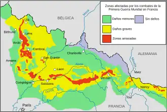Bajo la ley francesa, actividades como la urbanización, el cultivo o la silvicultura estuvieron temporal o permanentemente prohibidas en la zona roja, debido a las ingentes cantidades de restos humanos y animales y a los millones de municiones sin explotar que contaminaban la tierra. Se prohibió que algunas ciudades y pueblos volvieran a ser reconstruidos después de la guerra.
