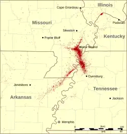 - 16 de diciembre de 1811, 0815 UTC (2:15 a. m.); (M ~7.5)[9] epicentro en el noreste de Arkansas, probablemente en la Falla de Cottonwood Grove;[10]: p. 7 causó solo leves daños en estructuras hechas por el hombre, debido a lo poco poblado del área del epicentro. La ubicación futura de Memphis, Tennessee fue afectada a una intensidad de un nivel de Mercalli nueve. Un seiche de origen sísmico se propagó río arriba y Little Prairie fue destruido por licuefacción de suelo.[11] Los solevantamientos locales del suelo y la vista de olas avanzando río arriba hicieron que los observadores se quedaran con a impresión de que el Río Misisipi estaba fluyendo al revés.[12]