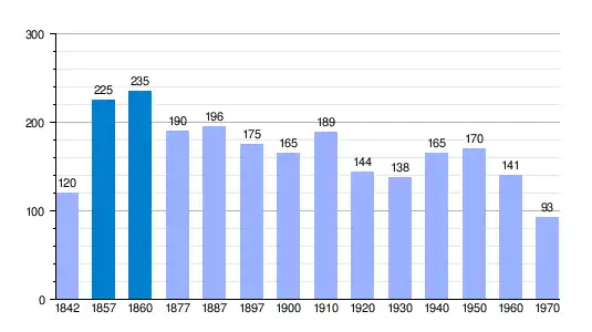 | Gráfica de evolución demográfica de Zumel[2] entre 1842 y 1970 |